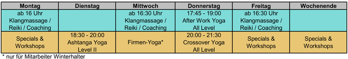 Unter Workshops und Specials sowie Unsere Gesundheitsangebote findest du unsere zusätzlichen Angebote für Yoga, Klangmassage, Reiki und psychologisches Coaching:
